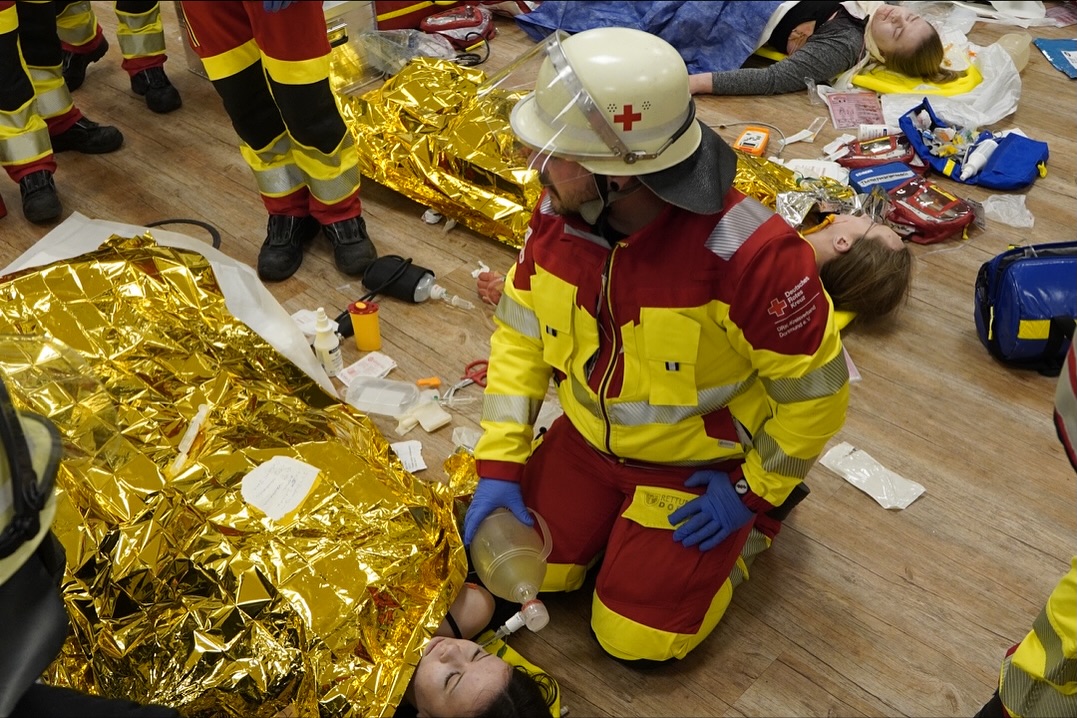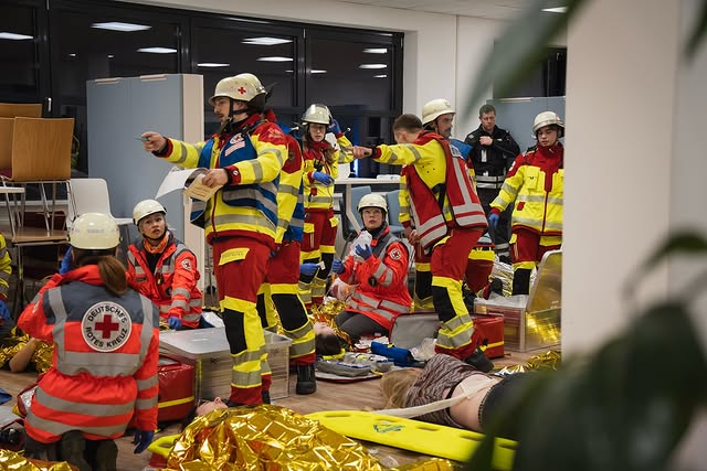 Mehr als 120 ehren- und hauptamtliche Helfer vom Deutschen Roten Kreuz (DRK) aus dem Katastrophenschutz, der Sondereinsatzgruppe Rettungsdienst (SEG RD) sowie die Notfallsanitäterauszubildenden des 2. und 3. Lehrjahres haben gemeinsam mit dem Löschzug 25 (LZ 25) der Freiwilligen Feuerwehr Dortmund am Sonntag, 9.11.2025, die notfallmedizinische und betreuungsdienstliche Versorgung von 34 Patienten nach einer Amoklage in einer Schule geübt.