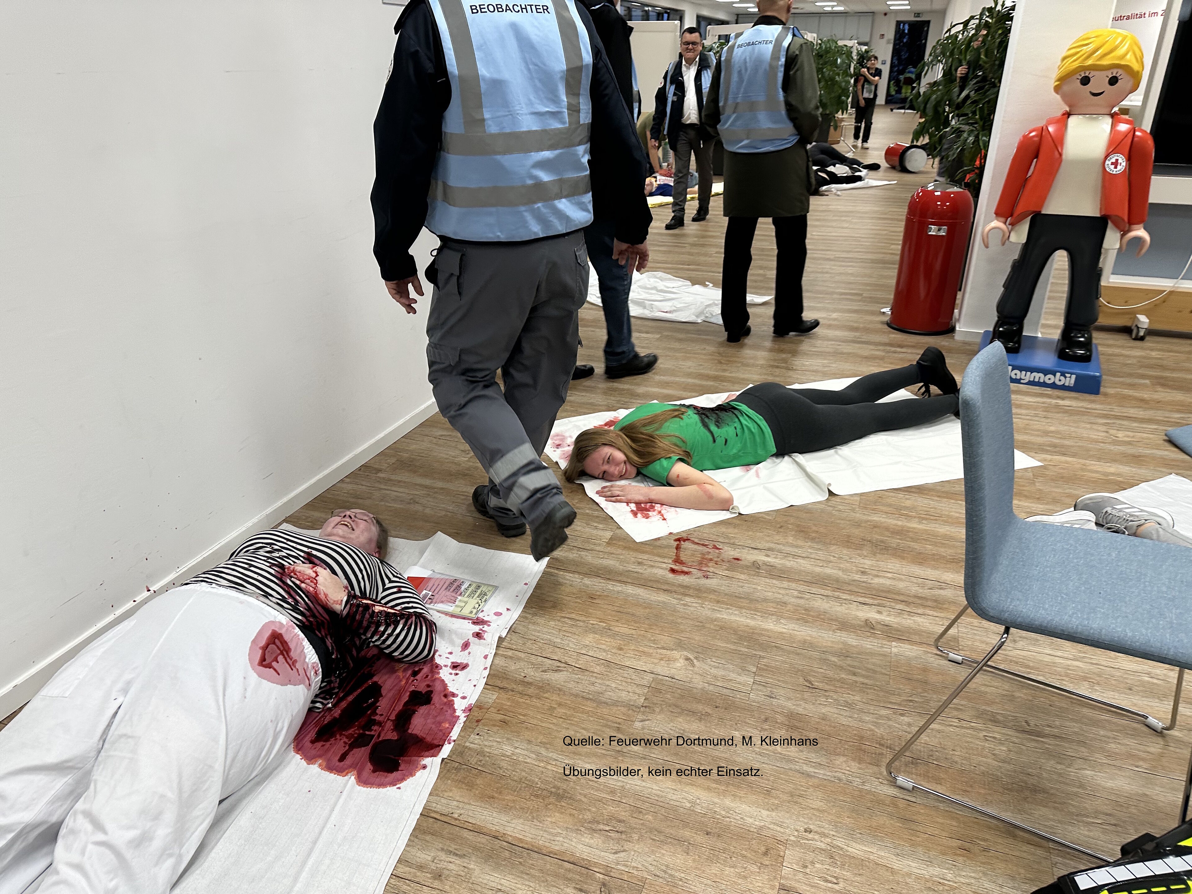 Am späten Nachmittag wurde der Alarm von der Leitstelle der Feuerwehr Dortmund für das DRK und den LZ 25 ausgelöst und die ehrenamtlichen Helfer sind aus dem gesamten Dortmunder Stadtgebiet zum Einsatzort an der Schleefstraße gefahren, um ihr fachliches Können unter Beweis zu stellen. Viele Verletzte, welche von Notfalldarstellern gespielt wurden, hatten schwere Stichverletzungen mit hohem Blutverlust oder waren von der herausfordernden Situation psychisch betroffen.