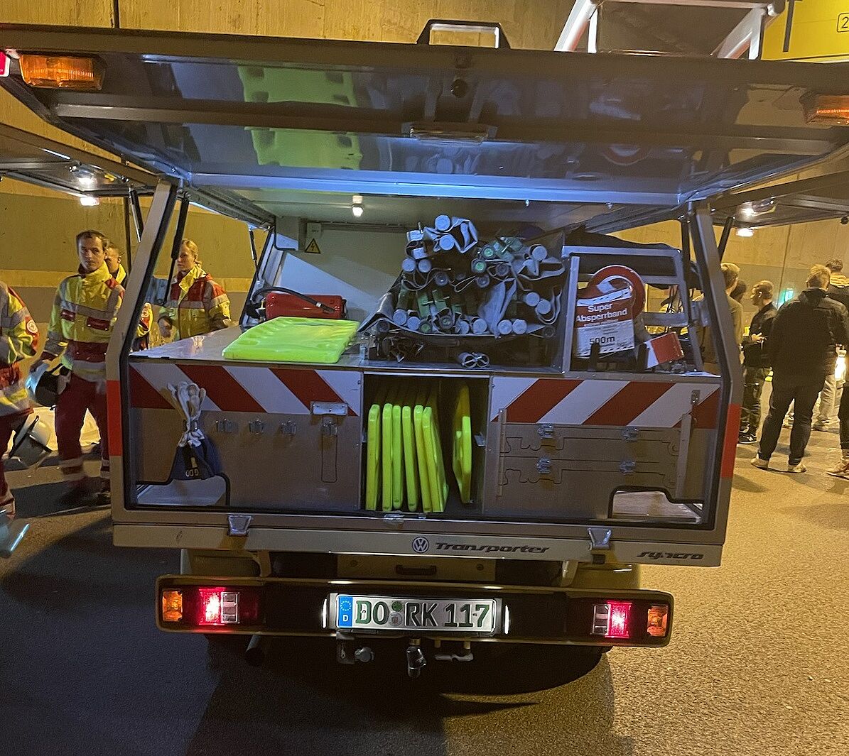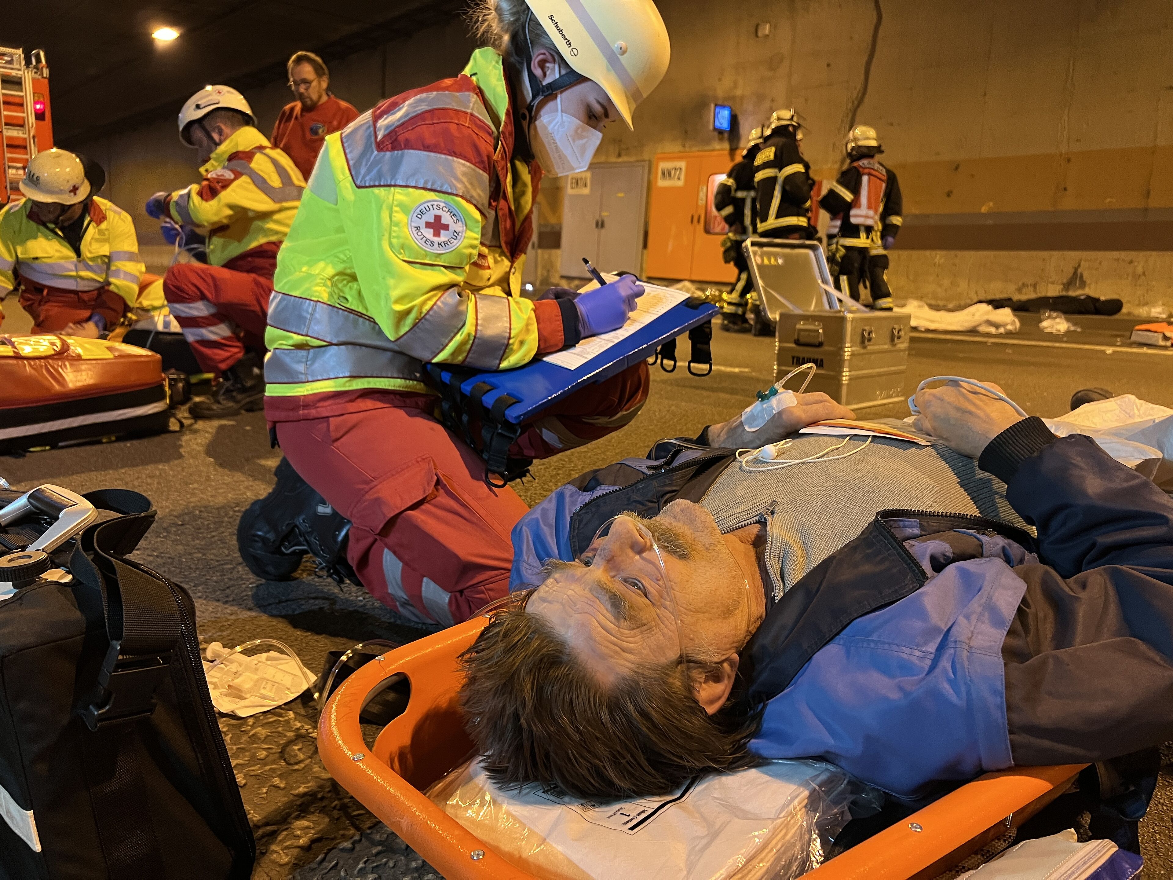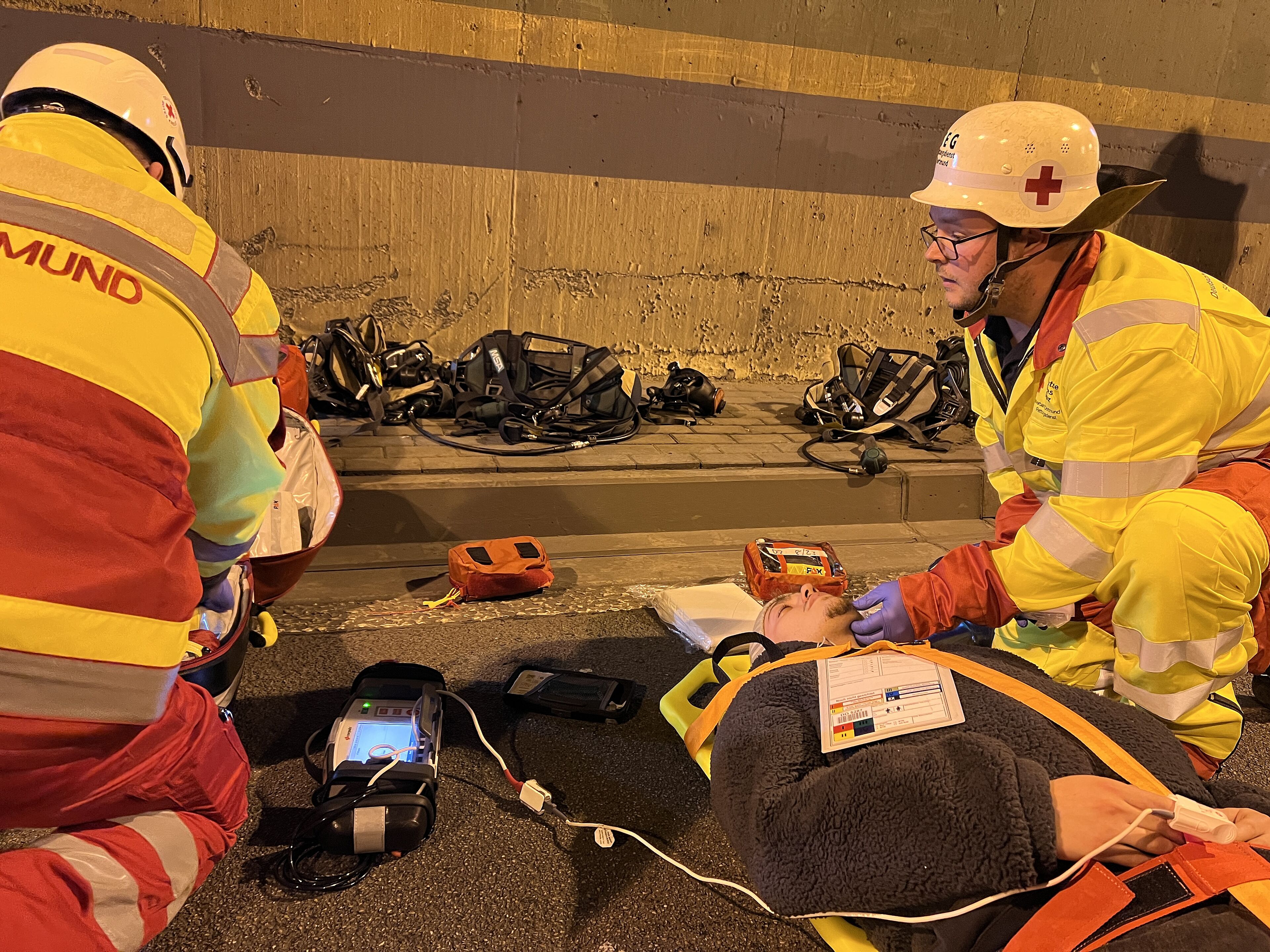 Im Wambeler Tunnel der B236 übten die Feuerwehr, die Dortmunder Hilfsorganisationen ASB, DRK, JUH und MHD, sowie die Polizei und Mitarbeiter*innen der Straßen NRW den Ernstfall. Bereits ab 17 Uhr trafen sich die Mitglieder der SEG an der Kreisgeschäftsstelle des DRK in der Beurhausstraße. Die 21 ausschließlich ehrenamtlich tätigen Rettungsdienstler*innen bereiteten sich, das Material und die Fahrzeuge für den Einsatz vor. Nach einer kleinen Stärkung verlegte die Gruppe um 19 Uhr ihren Standort zum Ausbildungszentrum der Feuerwehr. Die Führung der SonderEinsatzGruppe übernahm Lasse Schulz sowie der Zugführer Katastrophenschutz Ralph Andernach als Führungsassistent.