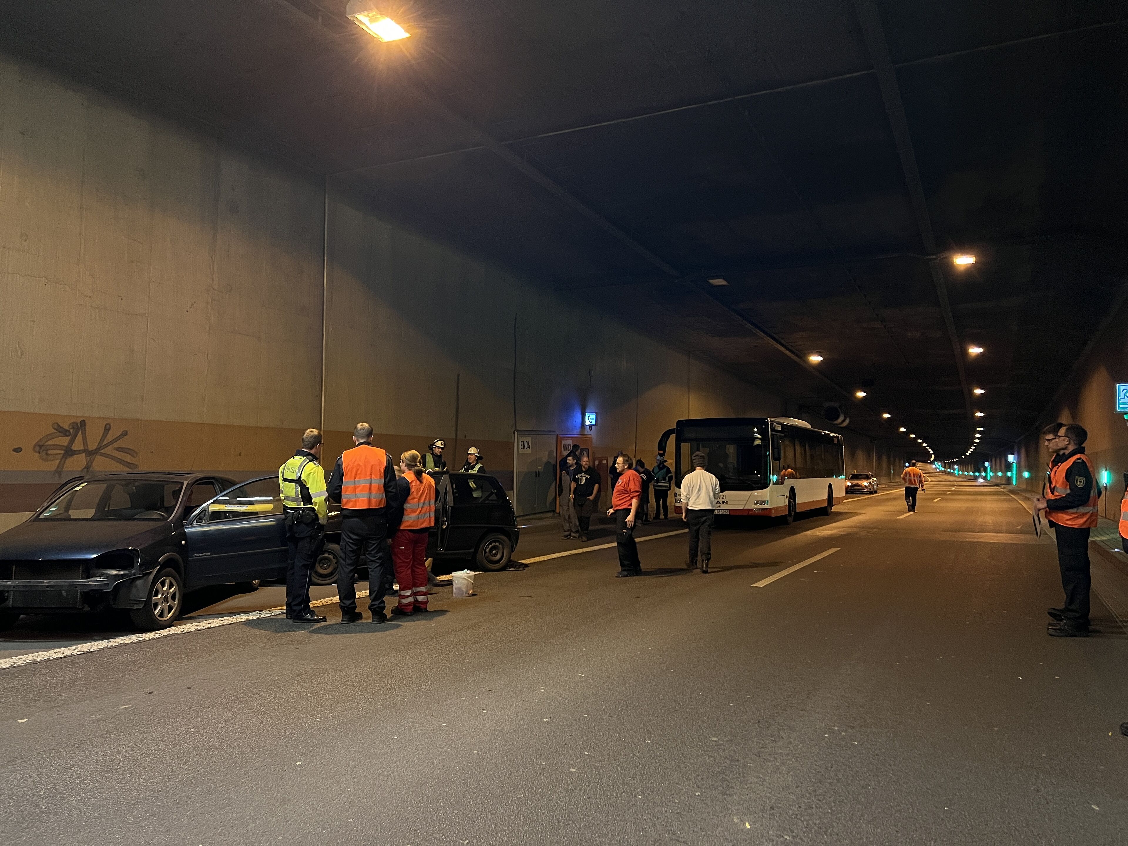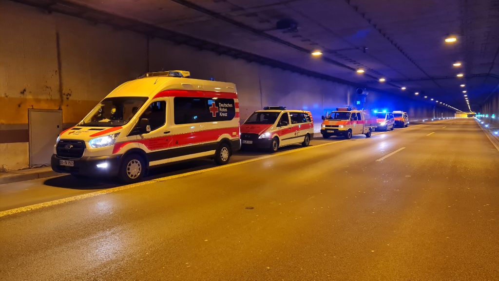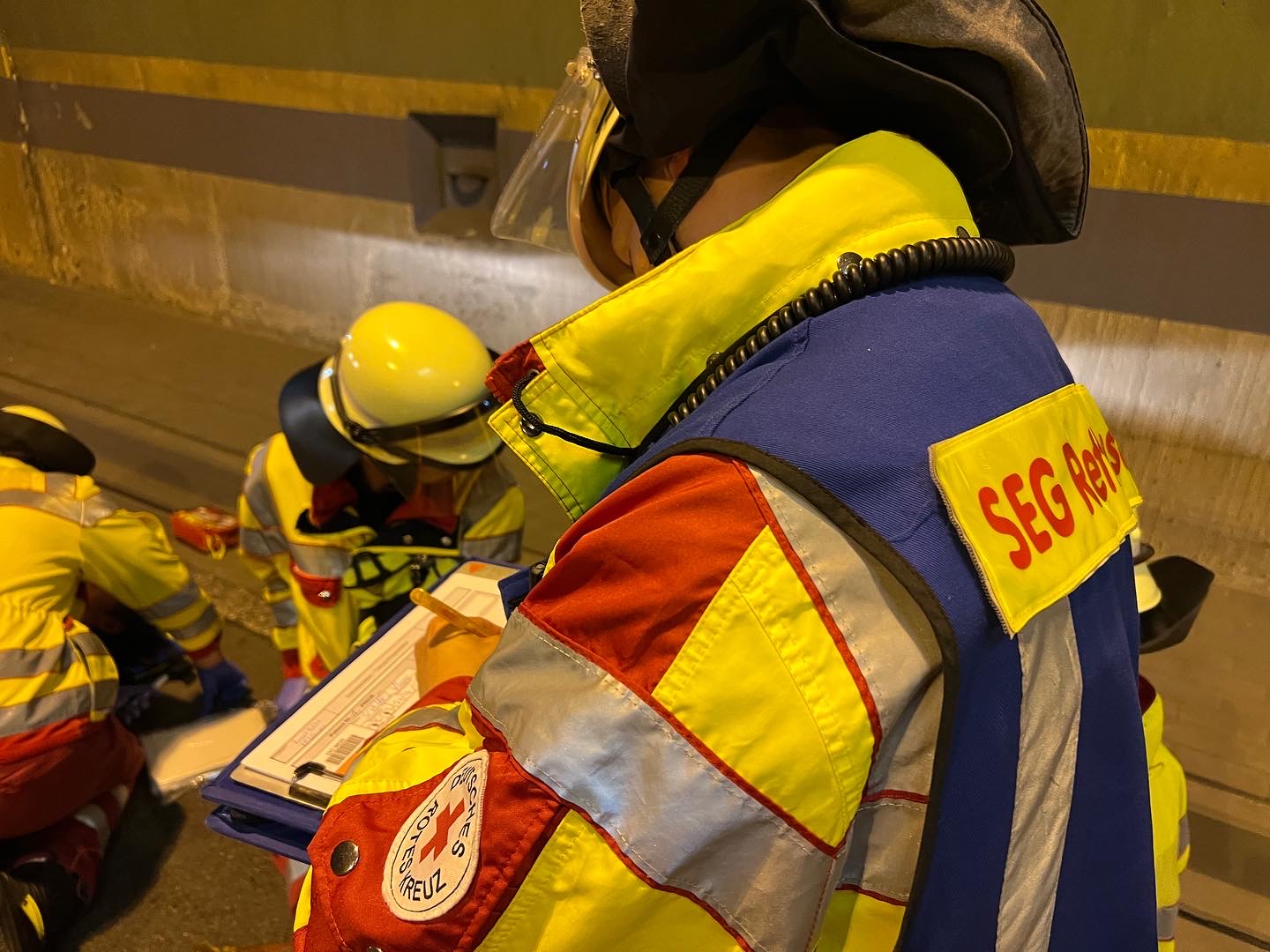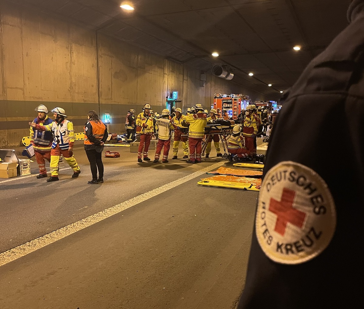 Im Wambeler Tunnel der B236 übten die Feuerwehr, die Dortmunder Hilfsorganisationen ASB, DRK, JUH und MHD, sowie die Polizei und Mitarbeiter*innen der Straßen NRW den Ernstfall. Bereits ab 17 Uhr trafen sich die Mitglieder der SEG an der Kreisgeschäftsstelle des DRK in der Beurhausstraße. Die 21 ausschließlich ehrenamtlich tätigen Rettungsdienstler*innen bereiteten sich, das Material und die Fahrzeuge für den Einsatz vor. Nach einer kleinen Stärkung verlegte die Gruppe um 19 Uhr ihren Standort zum Ausbildungszentrum der Feuerwehr. Die Führung der SonderEinsatzGruppe übernahm Lasse Schulz sowie der Zugführer Katastrophenschutz Ralph Andernach als Führungsassistent.