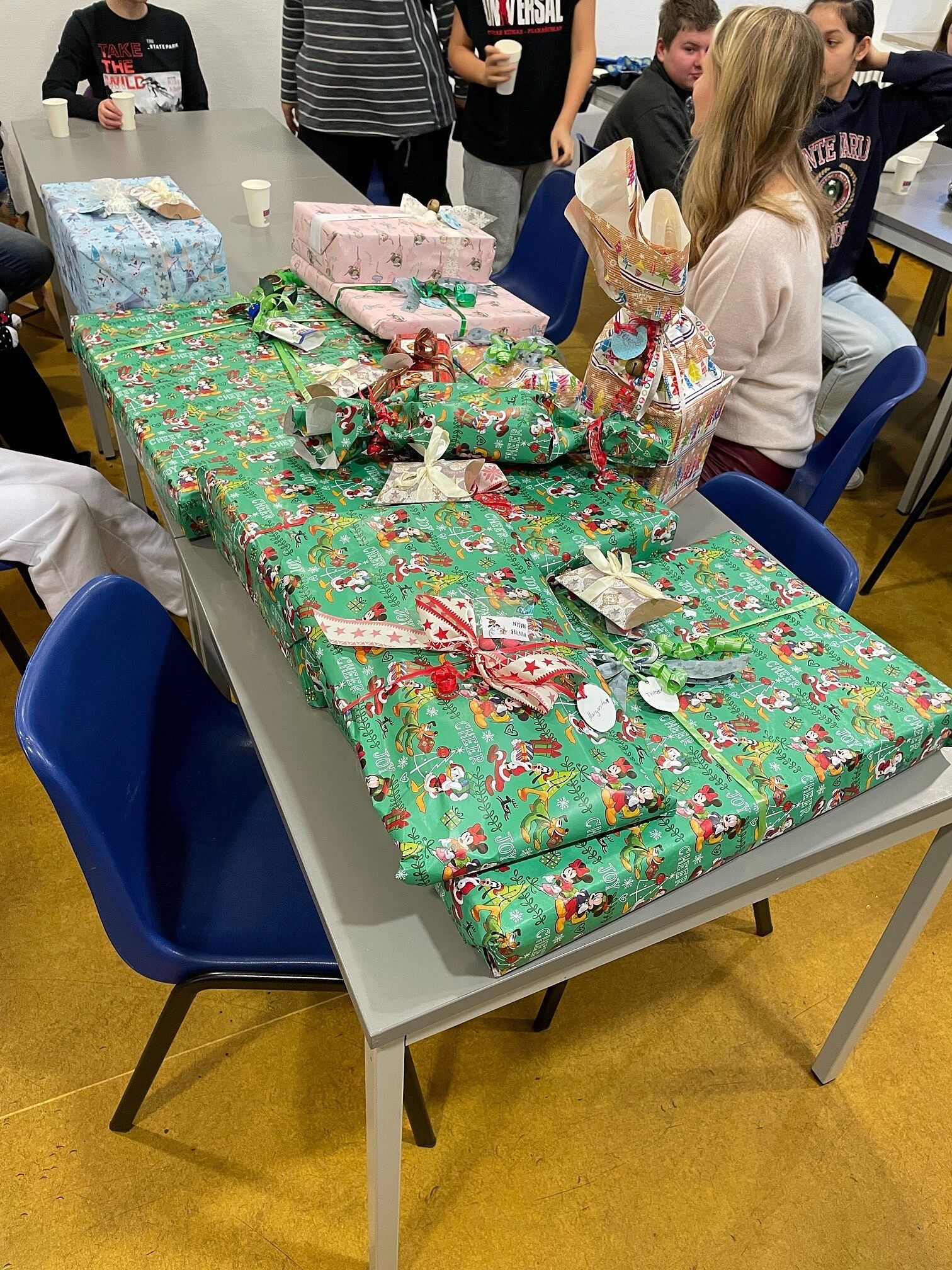 Die Schüler*innen wollten aber das gesammelte Geld nicht einfach "nur" spenden, sondern den geflüchteten Kindern aus der Ukraine Weihnachtswünsche erfüllen. Die Kinder aus unserem Übergangswohnheim haben die Gelegenheit genutzt und Wunschzettel gemalt und geschrieben. Durch die Schüler*innen wurden in Begleitung einer Lehrerin von dem gesammelten Geld Geschenke gekauft und am 21.12.2022 machte sich die Klasse mit zwei Lehrern auf den Weg zu einer gemeinsamen Weihnachtsfeier in der Unterkunft in Dortmund Derne. Bei Kuchen und Getränken wurden die liebevoll verpackten Geschenke überreicht und gemeinsam mit den Kindern ausgepackt. Danach wurden direkt die ersten Spielsachen gemeinsam aufgebaut und ausprobiert.