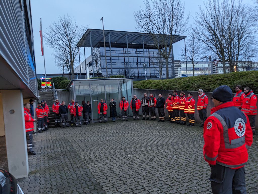 Für den Einsatz in Hamm haben sich innerhalb einer Stunde mehr als 33 Helfer*innen einsatzbereit gemeldet und wurden am Ausbildungszentrum des DRK-Kreisverbandes, in der Schleefstraße 2d, zusammengezogen. Unter der Leitung des diensthabenden Zugführers Tim Junkers und des Leitungsdienstes Markus Ackerschott wurden alle Helfer*innen auf den Einsatz vorbereitet. Die Planung sah einen Einsatz der ehrenamtlichen Helfer*innen von bis zu 24 Stunden, als Betreuungseinheit oder medizinische Erstversorgungseinheit für evakuierte betroffene Bürger vor.