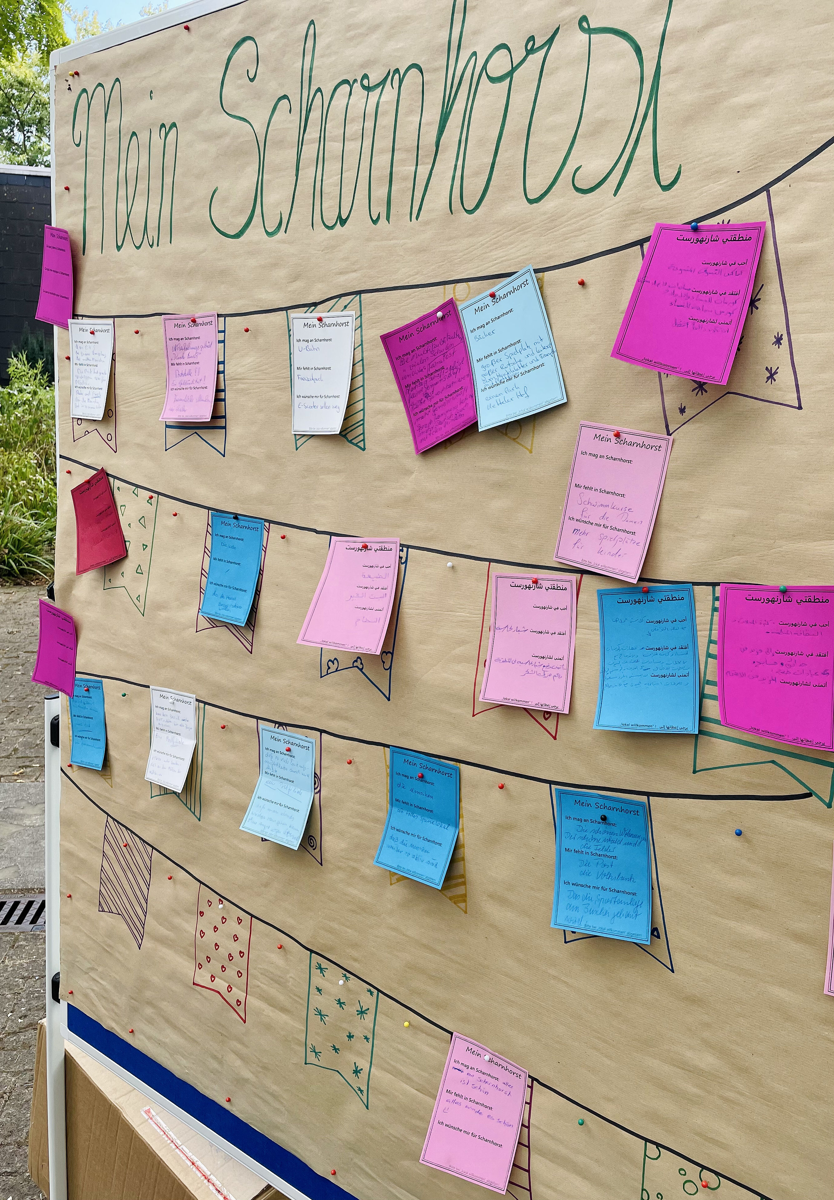 Um mit den Bewohner*innen des Stadtbezirks in den Austausch zu kommen und zu erfragen was sie beschäftigt, wurde eine „Wünschewand“ aufgestellt. Die Besucher*innen des Festes konnten hier notieren, was ihnen an Scharnhorst gefällt, was ihnen nicht gefällt und was sie sich für Scharnhorst wünschen. Im Nachgang werden die Antworten durch die Organisator*innen ausgewertet und an entsprechende Institutionen und Gremien weitergegeben.