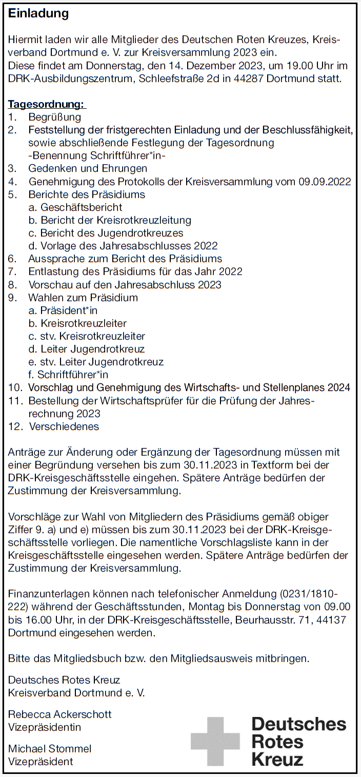 Liebe Freund*innen des DRK Kreisverbandes Dortmund, liebe ehren- und hauptamtliche Mitarbeiter*innen, liebe Rotkreuzler*innen,